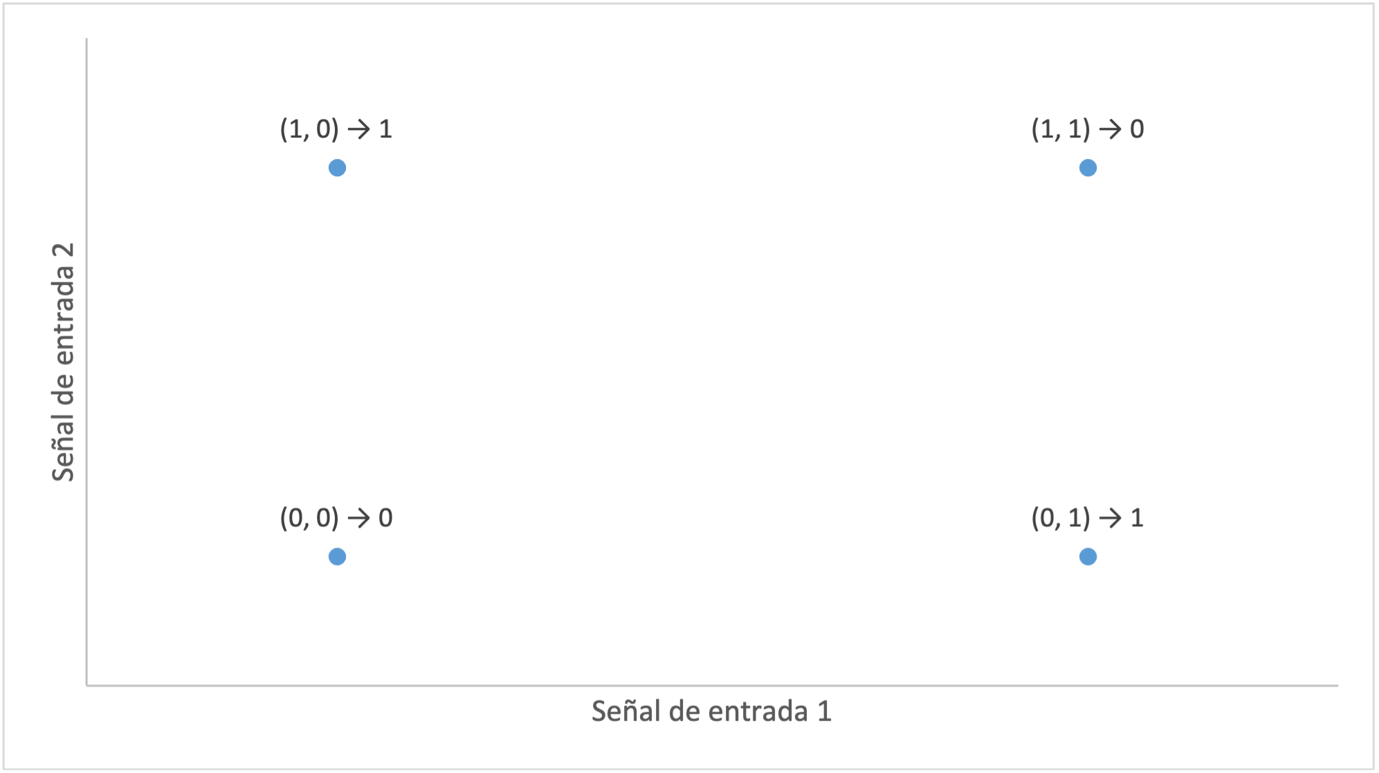 Una red neuronal simple que implemente el método de separabilidad lineal para clasificar los datos que están a su disposición no logrará representar, por más que lo intente, la disyunción exclusiva. En respuesta a la tentativa de aplicar esta función lógica, si el 0 simboliza a los números romanos, o a los vertebrados o a las democracias, y si el 1 hace lo propio con los número arábigos, o con los invertebrados o con las dictaduras, la red neuronal simple en cuestión los confundirá, colocando los ceros y los unos (con sus correspondientes referentes) en un solo lado de la línea de separación, cuando debería posicionarlos, más bien, en extremos opuestos: unos a la izquierda y otros a la derecha, unos abajo y otros arriba, unos en la esquina inferior interna y otros en la esquina superior externa o viceversa.