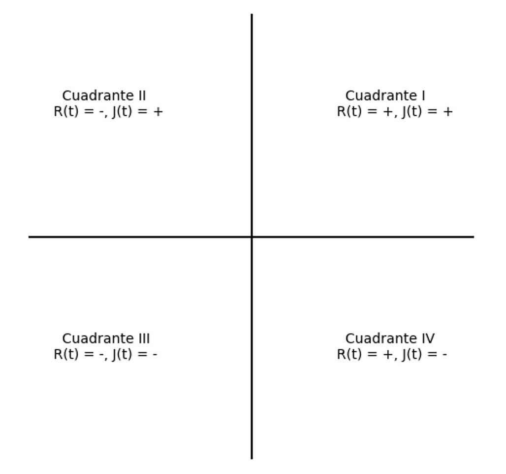 Al tratarse de un sistema dinámico de dos variables, podemos visualizar el comportamiento de los amantes en un eje cartesiano, donde el eje horizontal corresponde a R(t), y el eje vertical a J(t). De manera general contamos entonces con cuatro cuadrantes, donde podemos cartografiar los sentimientos de ambos amantes (véase imagen siguiente). Por ejemplo, en el primer cuadrante, ambos amantes se corresponden mutuamente (los dos tienen sentimientos positivos). En el segundo cuadrante hay una inconsistencia entre la pareja ya que Romeo no desea a Julieta (signo negativo), pero ella a él sí (signo positivo); con ello en mente, podríamos decir que el cuarto cuadrante es la imagen espejo del segundo cuadrante puesto que se invierten los roles: ahora es Julieta quien no desea a Romeo, pero él a ella sí. Finalmente, en el tercer cuadrante ambos tienen sentimientos de apatía u odio, por lo que probablemente terminen separándose debido al enfriamiento de la relación. Sin embargo, una apatía absoluta entre los amantes sería el punto de equilibrio de las ecuaciones diferenciales, es decir, aquel donde R(t) = J(t) =0.