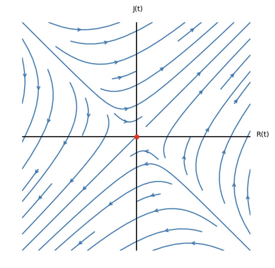 Comencemos con la mejor de las intenciones. Supongamos que los sentimientos de Romeo y Julieta se corresponden mutuamente, es decir, todos los parámetros son positivos. Al resolver las ecuaciones diferenciales para distintos puntos iniciales —las primeras impresiones también tienen voz y voto— se puede observar la siguiente dinámica4 de los sentimientos de los amantes: al punto de equilibro se le conoce matemáticamente como punto de ensilladura,5 el cual es inestable. Como consecuencia, la evolución temporal de los sentimientos de Romeo y Julieta van a ser repelidos cuando se acerquen al punto de equilibrio (nótese cómo las flechas se alejan de ese punto).