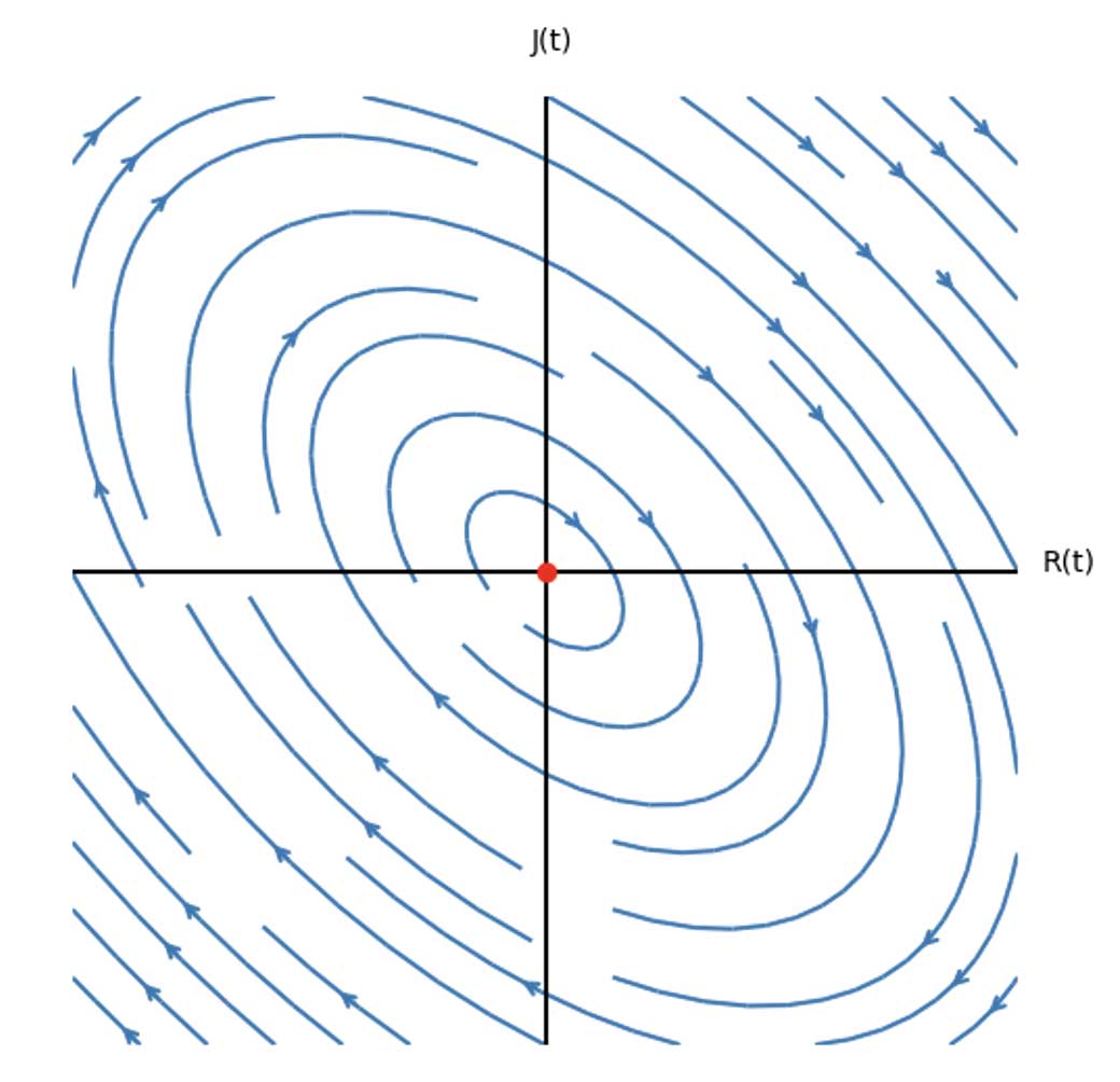 La dinámica sentimental resultante es un ciclo interminable de amor u odio (círculos alrededor del punto de equilibrio, clasificado matemáticamente como centro),6 donde las amplitudes de las oscilaciones de sus sentimientos dependerán de la primera impresión. Es decir, si la primera impresión se da cerca del punto de equilibrio, la amplitud de sus vaivenes sentimentales será pequeña, mientras que los vaivenes aumentarán (círculos más grandes) si la primera impresión ocurre lejos del equilibrio. Bajo esta perspectiva, podemos decir que Romeo y Julieta quedan atrapados en una relación viciosa, sin llegar a separarse. Aunque si sirve de consolación, una cuarta parte del tiempo disfrutarán de las mieles del amor (cuadrante I).
