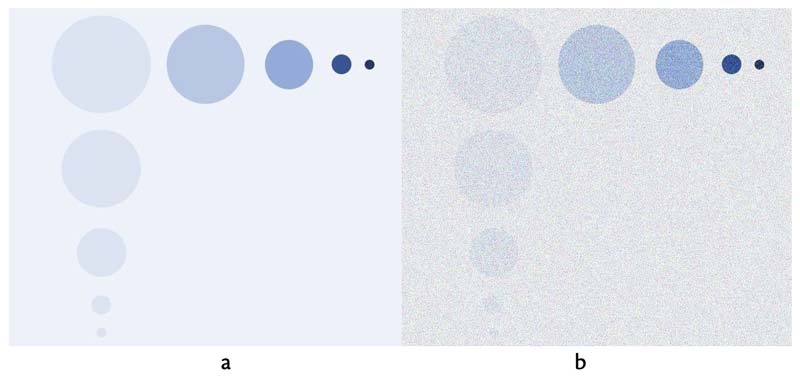 Figura 1. En la figura (a) se muestra una imagen nítida, donde los círculos verticales muestran un bajo contraste (poca diferencia entre los tonos de azul) y, conforme disminuye el tamaño del círculo, cada vez es más difícil verlo. En cambio, en los círculos horizontales que tienen alto contraste, es fácil verlos a pesar del tamaño. La imagen (b) muestra la figura (a) con ruido, por lo que la resolución espacial y resolución en contraste se ven afectados. La imagen es cortesía de la autora.